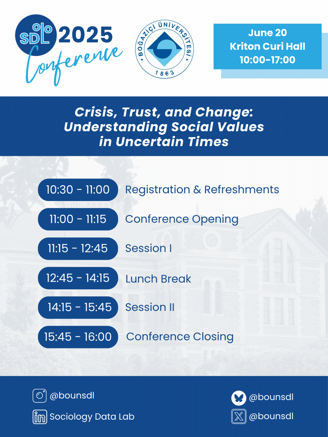 You are invited to the conference titled "Crisis, Trust, and Change: Understanding Social Values in Uncertain Times", organized by the Sociology Data Lab (SDL), which will be held on Friday, June 20 at Kriton Curi Hall.
