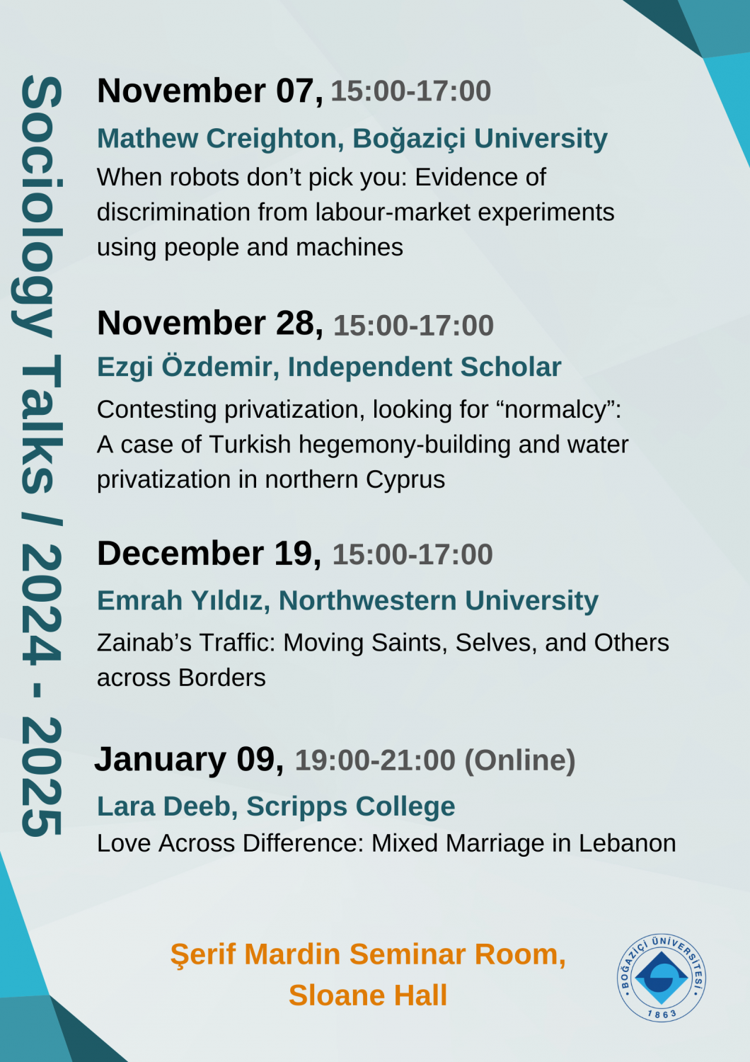 The Sociology Department at Boğaziçi University cordially invites you to the Sociology Talks 2024-2025 seminar series, which starts on November 7. Sociology Talks will be held in Şerif Mardin Seminar Room, Sloane Hall (Psychology & Sociology Building) between 15:00 – 17:00 unless otherwise specified. The series features talks by Mathew J. Creighton (Boğaziçi University), Ezgi Özdemir (independent scholar), Emrah Yıldız (Northwestern University) and Lara Deeb (Scripps College). Please see the flyer attached for full details. The seminar is open to all Boğaziçi University students and faculty.